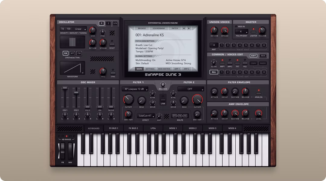 Dune 3 is the synth for producers who want wide, lush pads without crushing their CPU. The unison engine stacks voices for massive stereo spread. The wavetable capabilities let you create slowly shifting timbres.