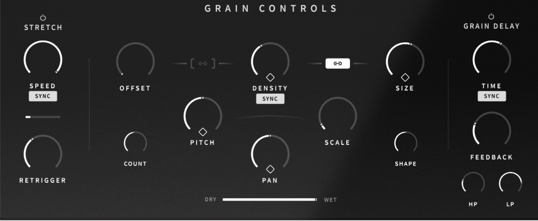 Offset will change the start point of concurrent grains, giving you control over the variability of the sound. The chain buttons between Offset, Density, and Size are called Ratio Locks, which give your sound a sequenced musical feel when enabled.
